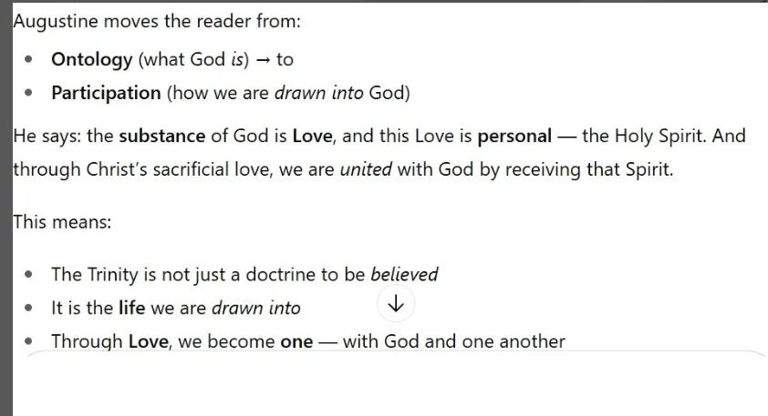The author is pointing out that this idea — that love shapes knowledge — is a major theme in the latter half of Augustine’s De Trinitate.