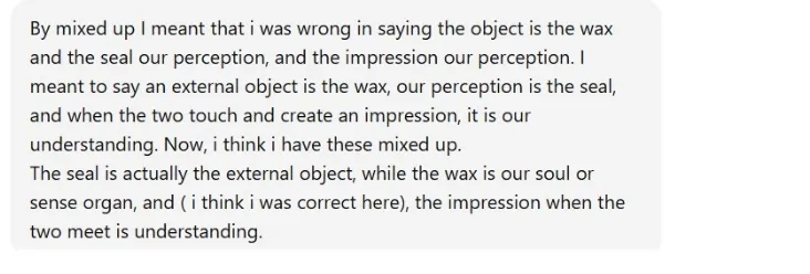 “The seal is actually the external object, while the wax is our soul or sense organ, and (i think i was correct here), the impression when the two meet is understanding.”