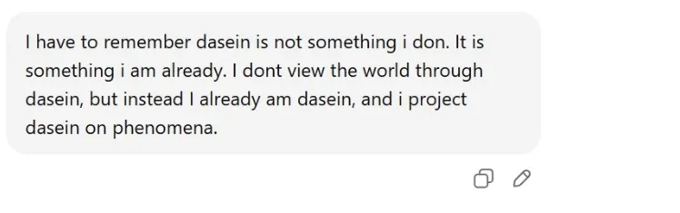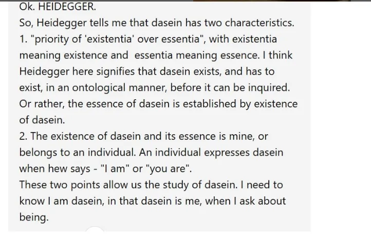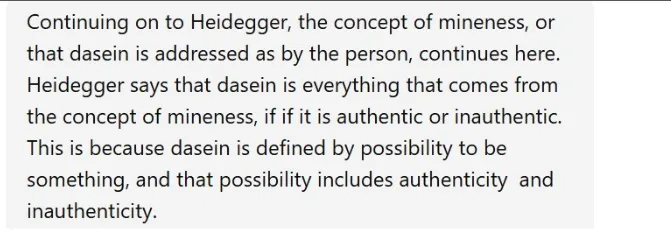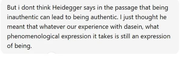 - Heidegger isn’t saying that Dasein disappears or becomes unknowable when it’s inauthentic — only that inauthenticity is one mode of its being.