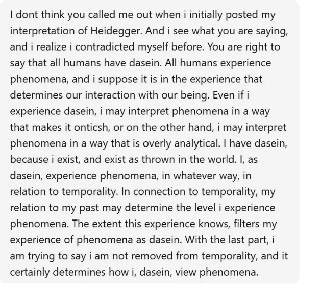 1. “All humans experience phenomena…even if I experience dasein, I may interpret phenomena in a way that makes it onticish…”