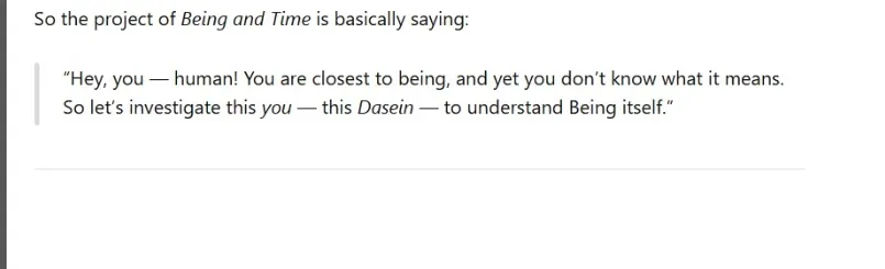 “Hey, you — human! You are closest to being, and yet you don’t know what it means. So let’s investigate this you — this Dasein — to understand Being itself.”