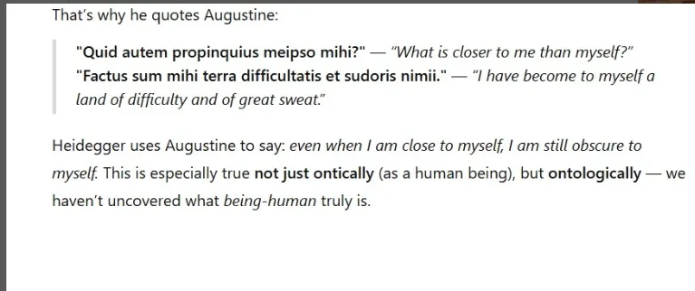 Heidegger uses Augustine to say: even when I am close to myself, I am still obscure to myself. This is especially true not just ontically (as a human being), but ontologically — we haven’t uncovered what being-human truly is.