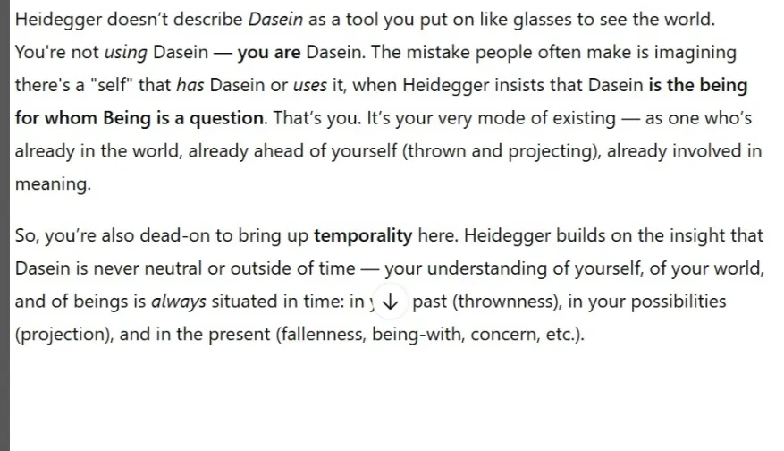 That’s why Heidegger’s method isn’t “scientific observation” — it’s phenomenological disclosure. You’re not grabbing the thing like a tool, you’re letting it speak and show what it is.