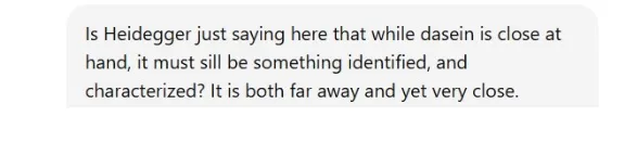 “Is Heidegger just saying here that while Dasein is close at hand, it must still be something identified and characterized? It is both far away and yet very close.”